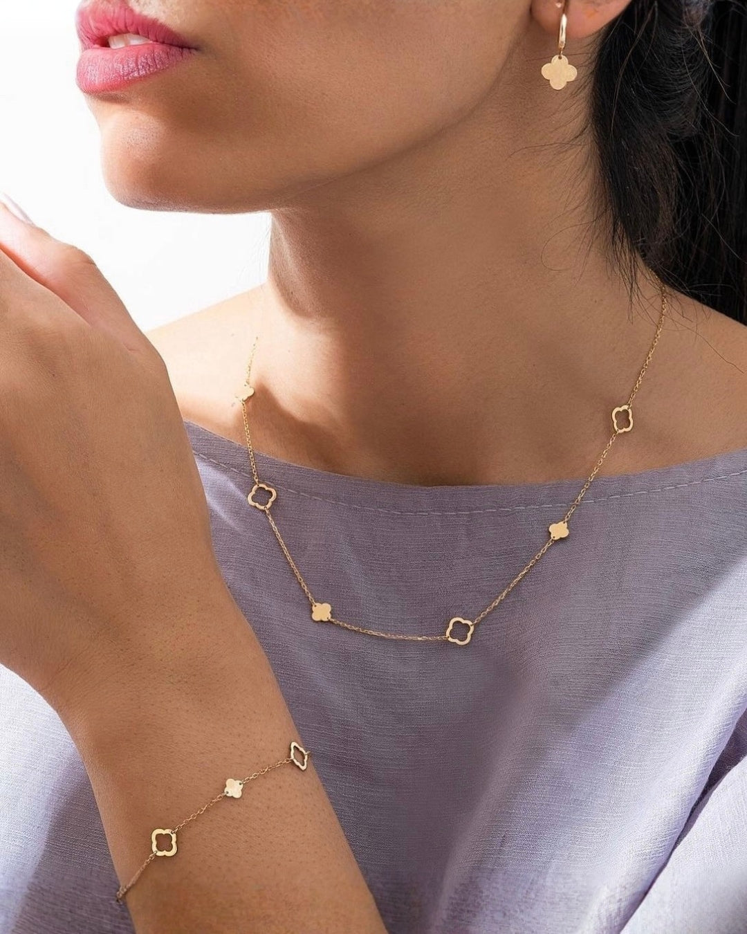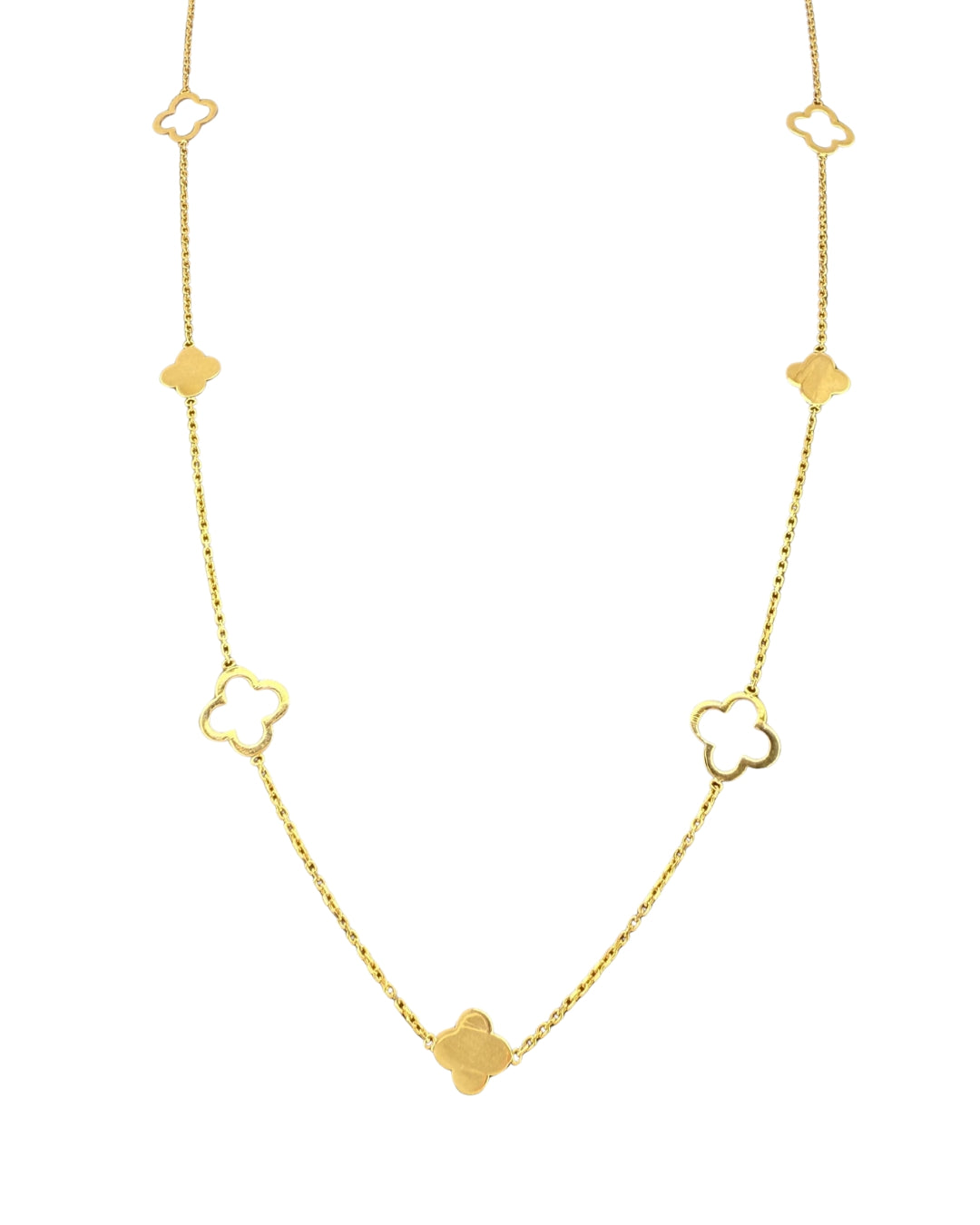 Design: abwechselnde Kleeblatt-Formen, verbunden durch feine Goldkette